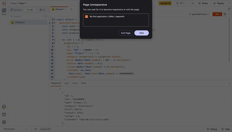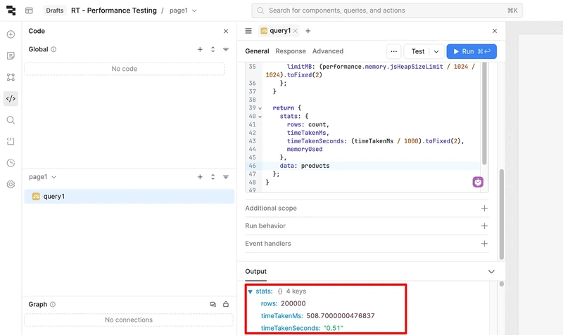 ToolJet had the fastest execution by a comfortable margin. Retool’s 500+ ms is not bad for that volume, just not best-in-class. Appsmith, unfortunately, didn’t survive the test at all. It froze before the table even had a chance to render.