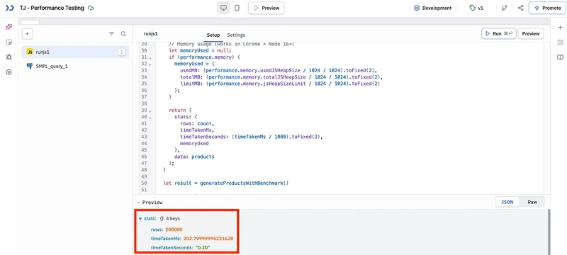 I tried the same 200,000-row JS query. It returned 15 rows, clearly truncated. Not to be dramatic, but that seemed like a red flag.