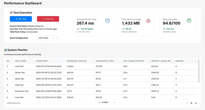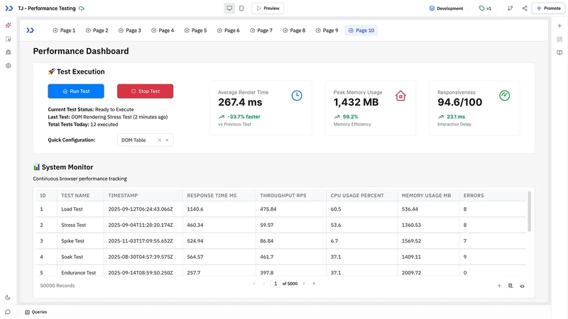 3) Test 2: “Real App” Stress Test (50,000 rows + 10-page application)