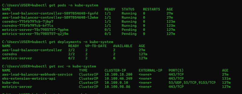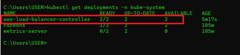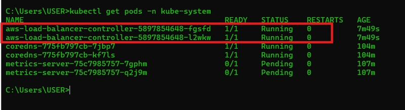 Now, you can verify the ALBController (aws-load-balancer-controller) Pods are up and running under the system namespace βkube-systemβ