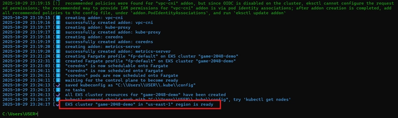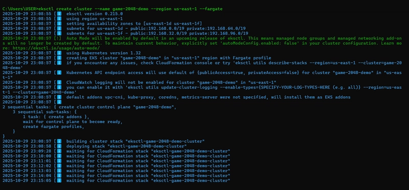 eksctl create cluster --name game-2048-demo --region us-east-1 --fargate