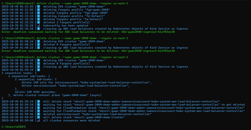 eksctl delete cluster --name game-2048-demo --region us-east-1