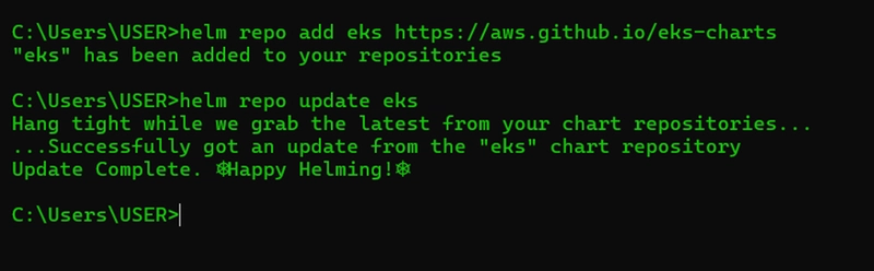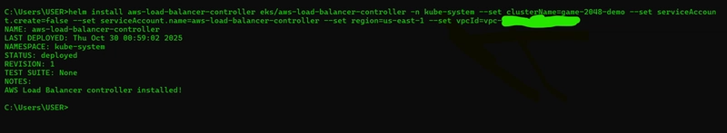 helm install aws-load-balancer-controller eks/aws-load-balancer-controller -n kube-system --set clusterName=game-2048-demo --set serviceAccount.create=false --set serviceAccount.name=aws-load-balancer-controller --set region=us-east-1 --set vpcId=vpc-xxxxxxxxxxxxx