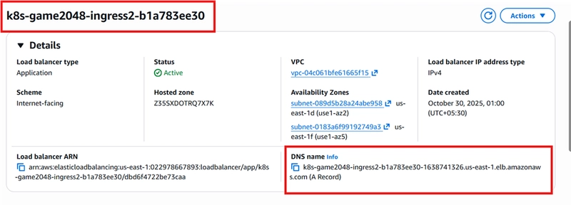 From the below screenshot, you can review that the AWS ALB is provisioned, and the same is reflected under the ingress resource with the ALB DNS name