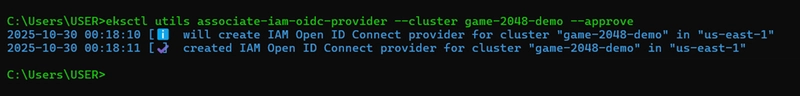 eksctl utils associate-iam-oidc-provider --cluster game-2048-demo --approve
