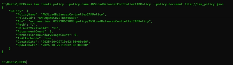 - Attaches the IAM policy specified by the ARN to the role, granting Load Balancer Controller permissions