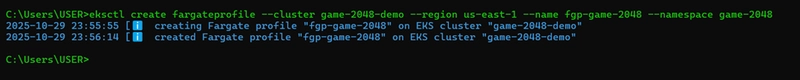 eksctl create fargateprofile --cluster game-2048-demo --region us-east-1 --name fgp-game-2048 --namespace game-2048