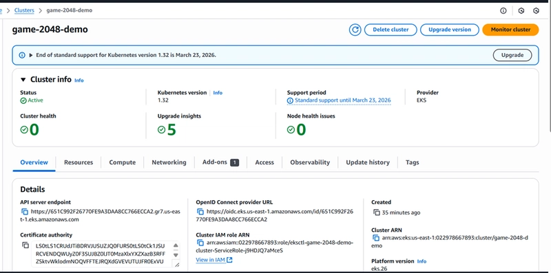 Review and confirm the cluster βgame-2048-demoβ created from AWS management Console as well