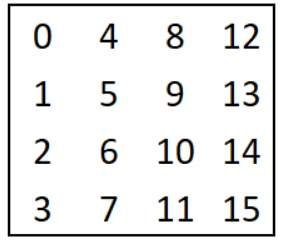Blocks are drawn as 4×4 matrices of numbers 0-255. In C, we represent them as a flat array uint8_t[16] when declared on stack, and as uint8_t* when malloc’ed. The following block is {0,1,2,...,15} in C.