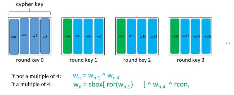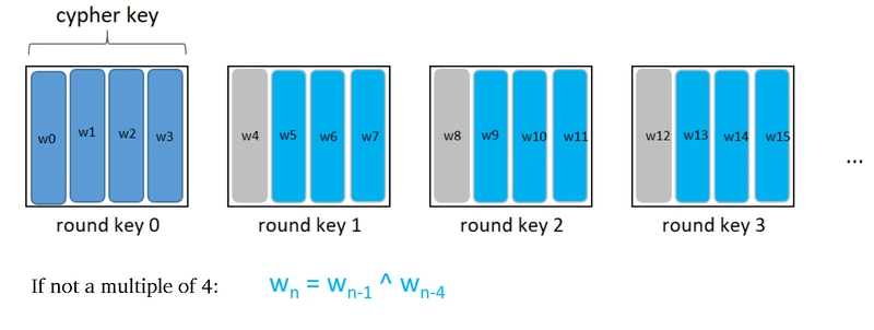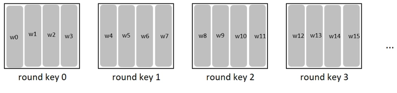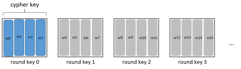 The 11 round keys are all 4×4 blocks, and in C we’ll represent them as flat arrays of 16 bytes. We denote the columns as w0, w1, … w43.