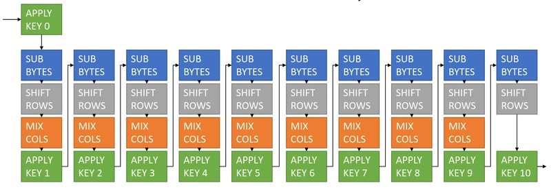 The 11 “Apply Key” steps all use a different round key, derived from the main cipher key using the function getNthRoundKey.
