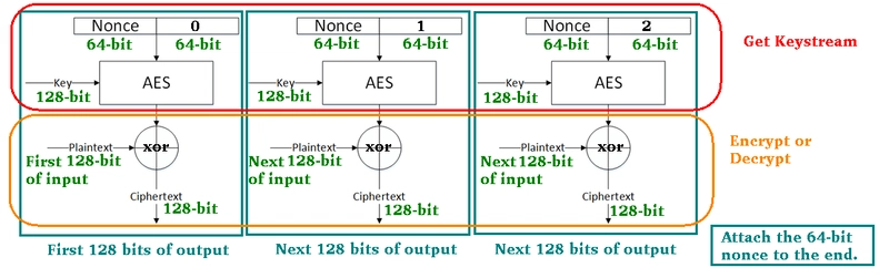 To decrypt it, we extract the nonce from the end of the file, then do getKeystream and call decrypt on all 16-byte blocks as shown.