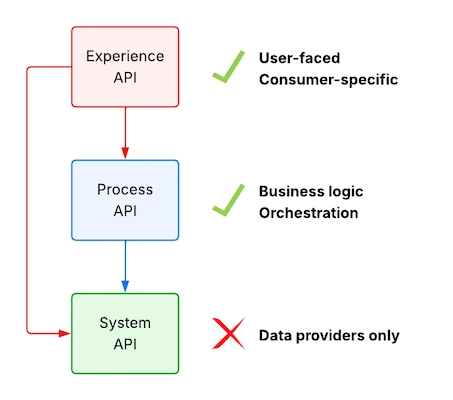 Thin Experience APIs: If an Experience API doesn’t make many changes, like if it’s just a pass-through layer for analytics dashboards, it might be fine to use the Process API model directly, especially if performance is important.