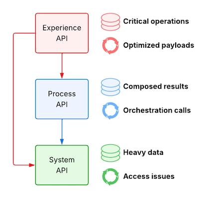 - Process API: For orchestrated calls to several systems, especially when one might fail from time to time.