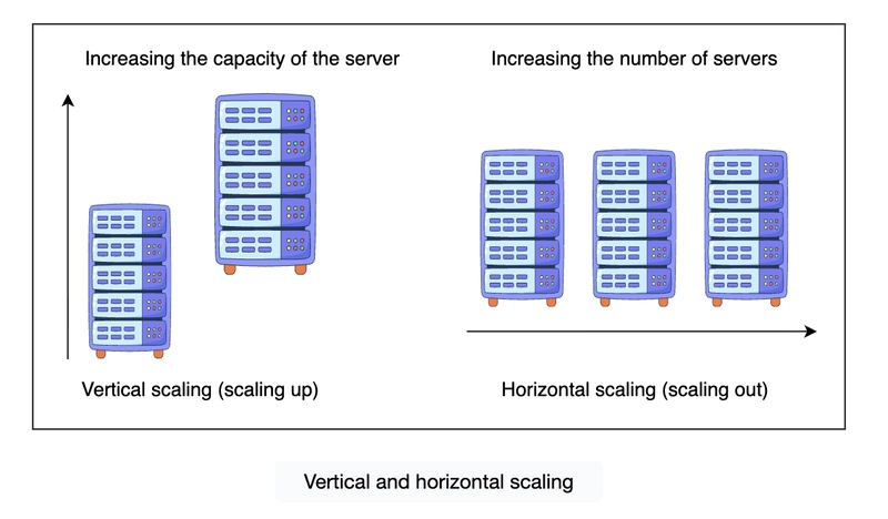 - Vertical scaling, or scaling up, means upgrading the existing server by adding more CPU, memory, or storage. This enhances the capabilities of a single machine, allowing it to handle more load independently.