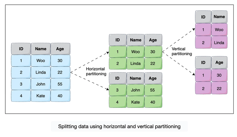 Data partitioning and sharding are strategies for breaking large datasets into smaller, more manageable pieces to improve performance and scalability. In partitioning, data is divided within a single database instance, often across tables or files based on logical rules such as date ranges or user IDs. This helps reduce query load and improve access speed by limiting the data each query has to scan. Partitioning usually happens at the database level and stays transparent to the application logic. There are two types of partitioning: horizontal and vertical partitioning, as explained with the help of the following visual: