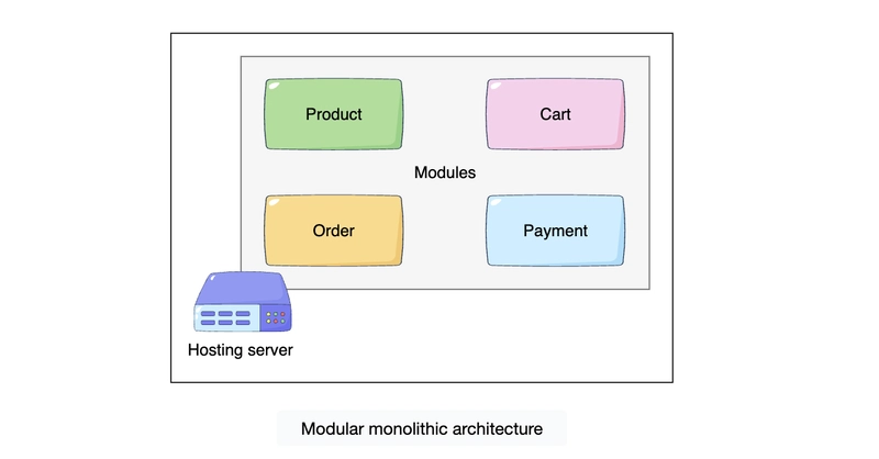 – Modular monolithic architecture: A modular monolith keeps the single deployable unit of a monolith but organizes its internal structure into well-defined, loosely coupled modules. This approach balances simplicity and maintainability, allowing teams to enforce boundaries and scale development without the full complexity of microservices. The illustration below depicts a modular monolithic architecture for an e-commerce system, where all services are structured as separate modules within a single deployment.