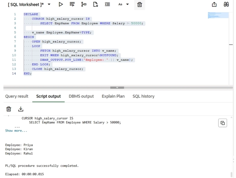 A Cursor in SQL works like a pointer that allows you to process rows one by one from a query result.