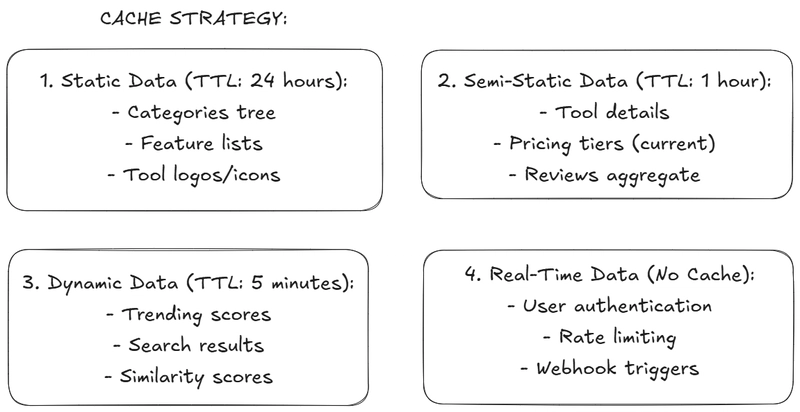 Support hierarchical categories, pricing history, similarity scoring, integrations, reviews aggregation, and changelog tracking.