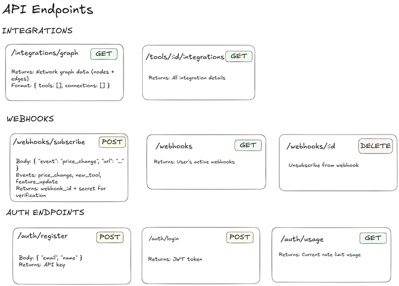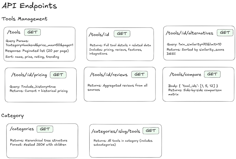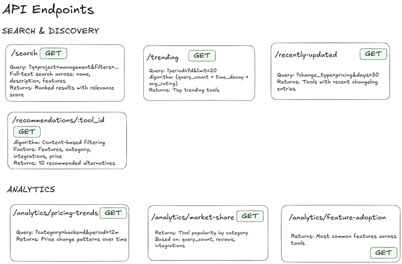 Implement endpoints for tools listing, tool details, alternatives, pricing, reviews, comparison, categories, category tools, search, trending, recently updated, recommendations, integrations graph, tool integrations, and pricing analytics.