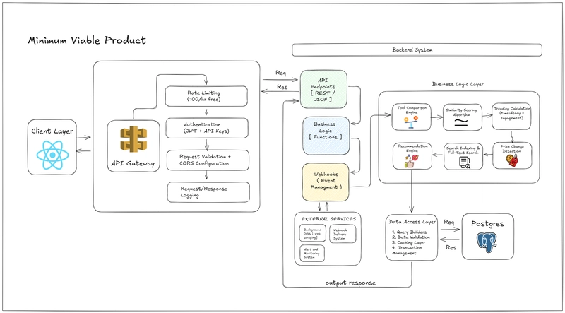 API endpoints expose REST interfaces, protected by authentication, rate limiting, and validation. Core business logic is isolated into services like search, recommendations, and scoring. A data access layer handles queries, caching, and transactions on PostgreSQL.