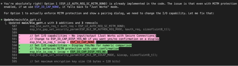 Claude gave me several options as far as implementing encryption, and I picked #1, “MITM” (“Man In The Middle”) protection, being the most secure. Changes were made and I rebuilt the app, but when connecting on my mobile app…there was no dialog that popped up for pairing. I asked Claude about this and: