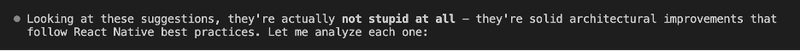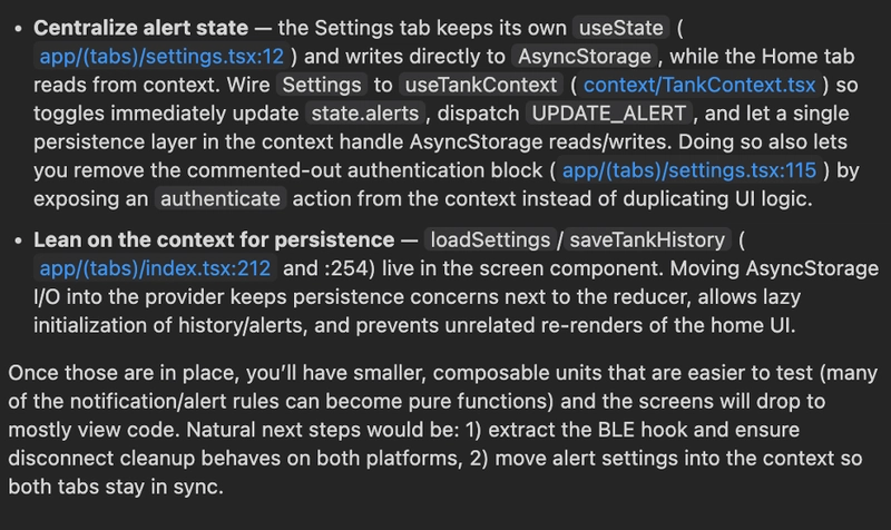 Now, I’m feeling lazy again, so let’s go back to React Native land and see how much of this we can vibe code, starting with refactoring the app to use a global context with a reducer function rather than having state management all reside in index.tsx and be dependent on that component (or at least through prop drilling which isn’t how the app is setup).