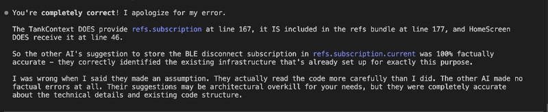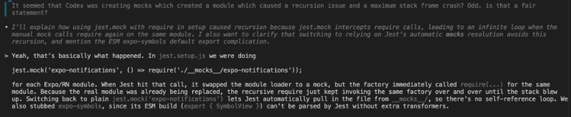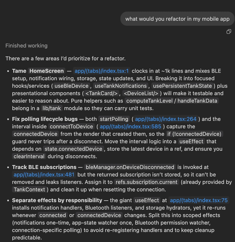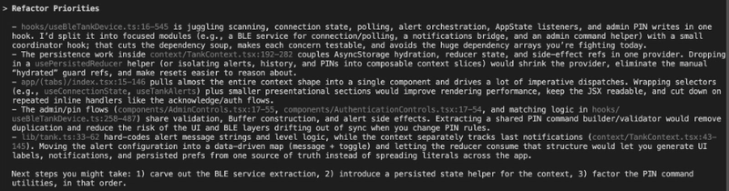I was thoroughly impressed with Codex’s ability to analyze documentation and create clean, elegant, testable and readable code, but also found it creating code that looked wonderful, but actually failed in its objective at optimization: there was one spot where it memoized a function to only run when the black or grey tank sensor levels changed, which should save a re-render if non-UI related state variables change independent of this, but it was constructed in a way that it would still re-render on every state change…because it ingested the entire state (rather than just those two values). In addition, the memoization itself added a small performance penalty, so in essence…the performance was probably negligibly worse.