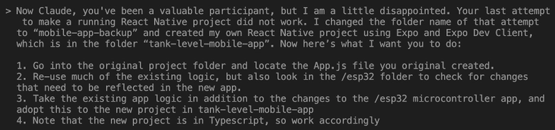 Ok. Let’s let Claude do some of its automagic. I’m in a salty mood while writing this blog entry, so I’m going to make Claude earn its keep today. Before I created a new app with the official command line utilities, I changed the old app’s folder name to mobile-app-backup. Opening up the new app folder and a new Claude instance in the VS Code terminal, the “annoyed Dad” side of me comes out: