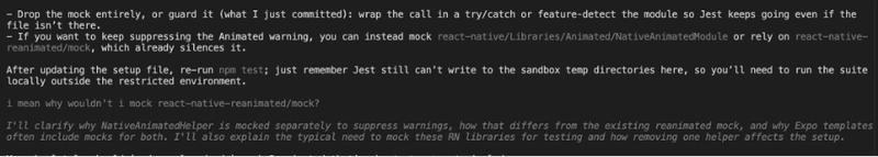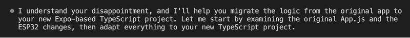 Claude thinks our React Native project structure is incorrect, and asks us to eject the project. I don’t want to do that- I want to build it with the latest snazzy version of Expo, the framework that sits on top of React Native to make things easier. It suggests that we install the package expo-dev-client, and work from there, which I agree with because a limitation of using React Native with Expo Go: Expo Go on its own only allows you to work with native modules included with Expo Go. Unfortunately, a Bluetooth client is not one of them.
