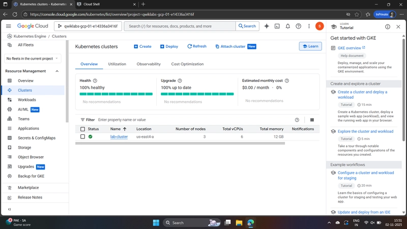 A GKE cluster is made up of a Master (control plane) and multiple Nodes (worker machines). We’ll create a cluster named lab-cluster with e2-medium nodes.