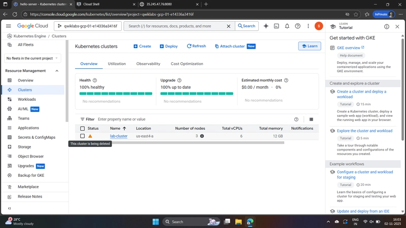 A key part of cloud computing is cleanup to avoid unnecessary costs. Deleting the cluster removes all associated resources, including the nodes, Pods, Deployments, and the Load Balancer Service.