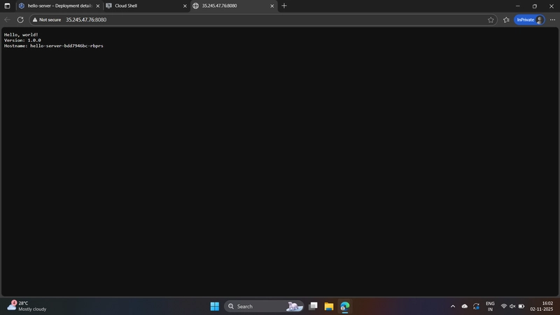 Once the IP is visible (e.g., 35.245.47.76), open your web browser and navigate to: http://[EXTERNAL-IP]:8080