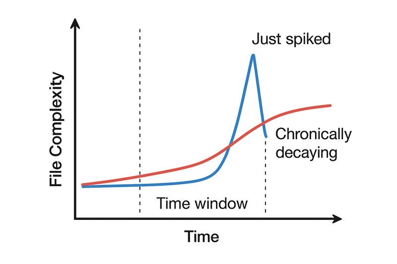 A file’s current complexity score is only half the story. The real diagnostic question is: Did this file just spike in complexity this sprint, or has it been chronically decaying for a year?
