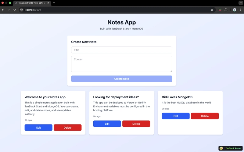 Try creating a new note. If everything is set up correctly, it should appear instantly. The data is persisted in MongoDB, and the UI stays in sync automatically thanks to TanStack Start’s server functions. Here’s what the app looks like with a few notes created 👇