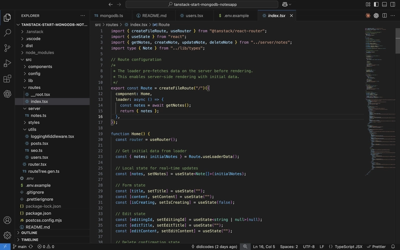 The home route for the app is going to live in src/routes/index.tsx. This file will define the Notes route and UI and act as the main entry point for displaying and managing notes. Since the implementation is fairly long, I’ve linked the full file on GitHub instead of pasting it here. So, go to this GitHub file, then copy the code and paste it into your src/routes/index.tsx file.
