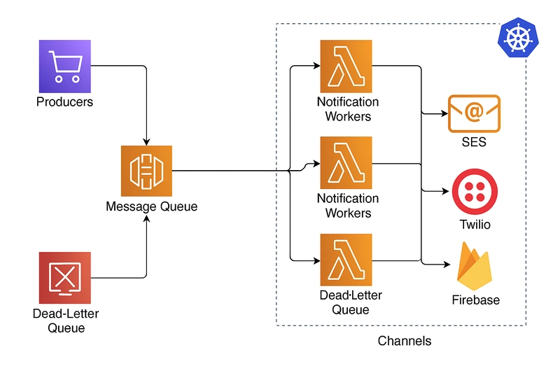 event_id,user_id,channel,status, andlatency. - Distributed tracing to link producer → queue → worker → provider.