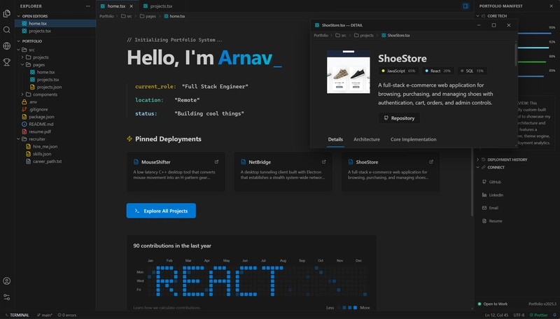 So I decided to build a VS Code–inspired portfolio that actually looks and behaves like an IDE. The goal was simple: when a developer opens it, it should feel instantly recognizable.