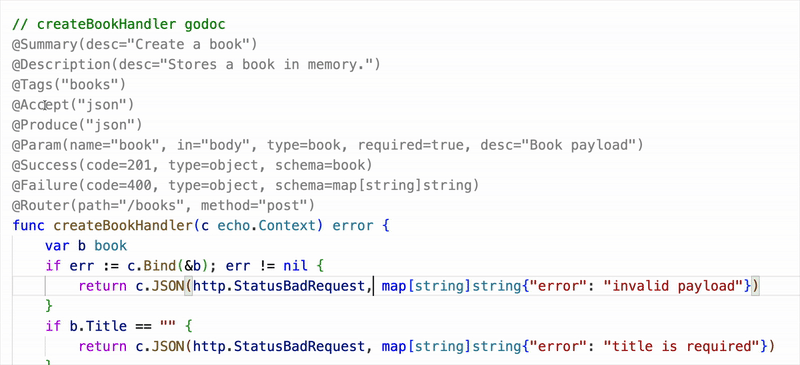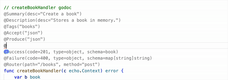 PS: This doesn’t change Go at all, it’s just editor sugar that outputs regular swaggo comments. Your code stays 100% compatible with everything.
