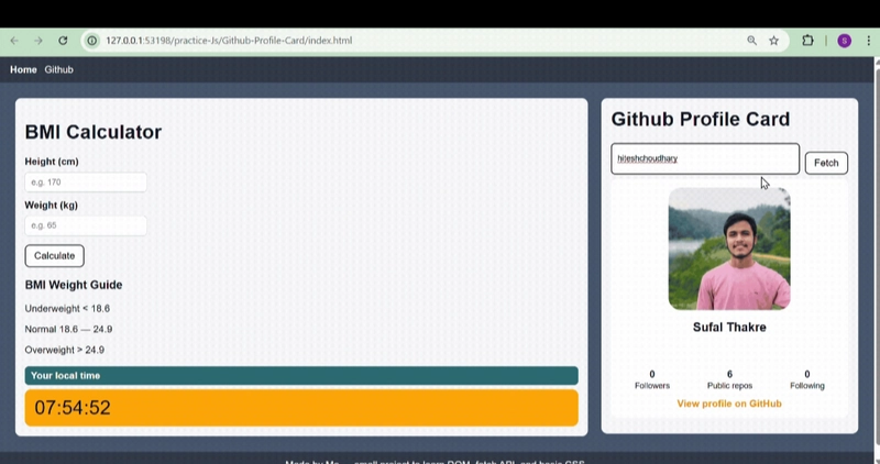 I just finished a beginner project combining a BMI calculator, a live clock, and a GitHub profile card using the GitHub API.