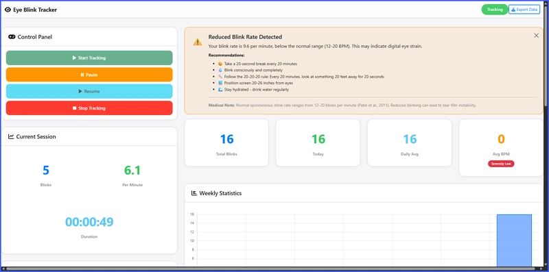 Protect your vision in the digital age. Kan [கண்] is an intelligent eye health monitoring application that tracks your blink rate in real-time, provides health insights, and helps prevent digital eye strain through continuous background monitoring.
