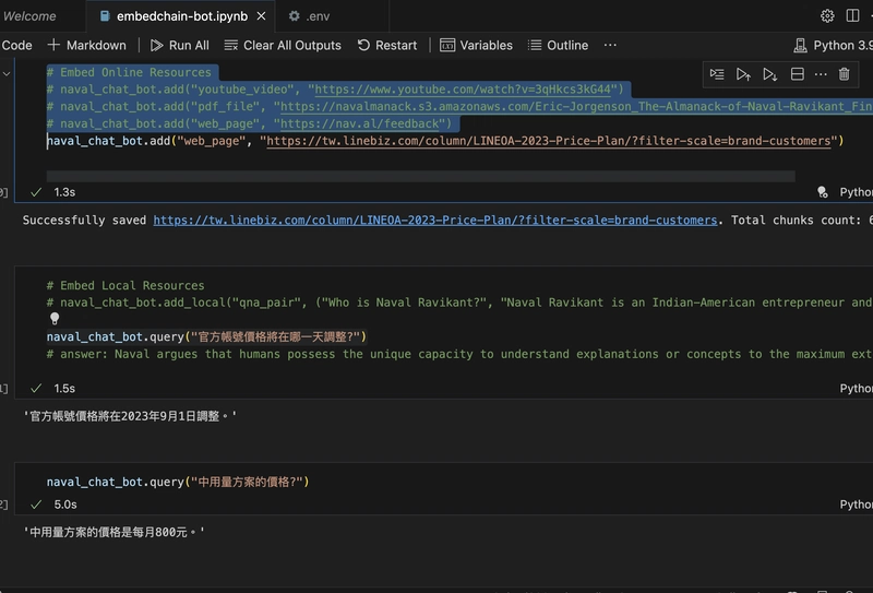 With this EmbedChain, you can fetch many types of data. This image is a test of it fetching data from the webpage “2023 LINE Official Account Plan Price Adjustment, Key Points at a Glance” to reply to users.