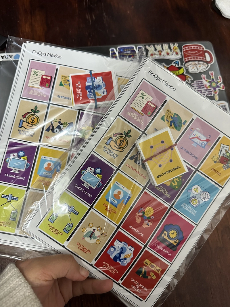 ¡Al menos el 80% de las personas que llegaron al chill room, no habían jugado lotería jamás! Como mexicana en el extranjero no podía permitirlo. Los conceptos que contiene son clave de la metodología, como la FinOps Foundation, presupuestos nube, costo amortizado, ahorros, optimización, etc., después de cada ronda explicamos en lo general los conceptos de la lotería, cuidando, mencionar la relación entre ellos, y destacando su importancia para el desarrrollo de proyectos e iniciativas eficientes.