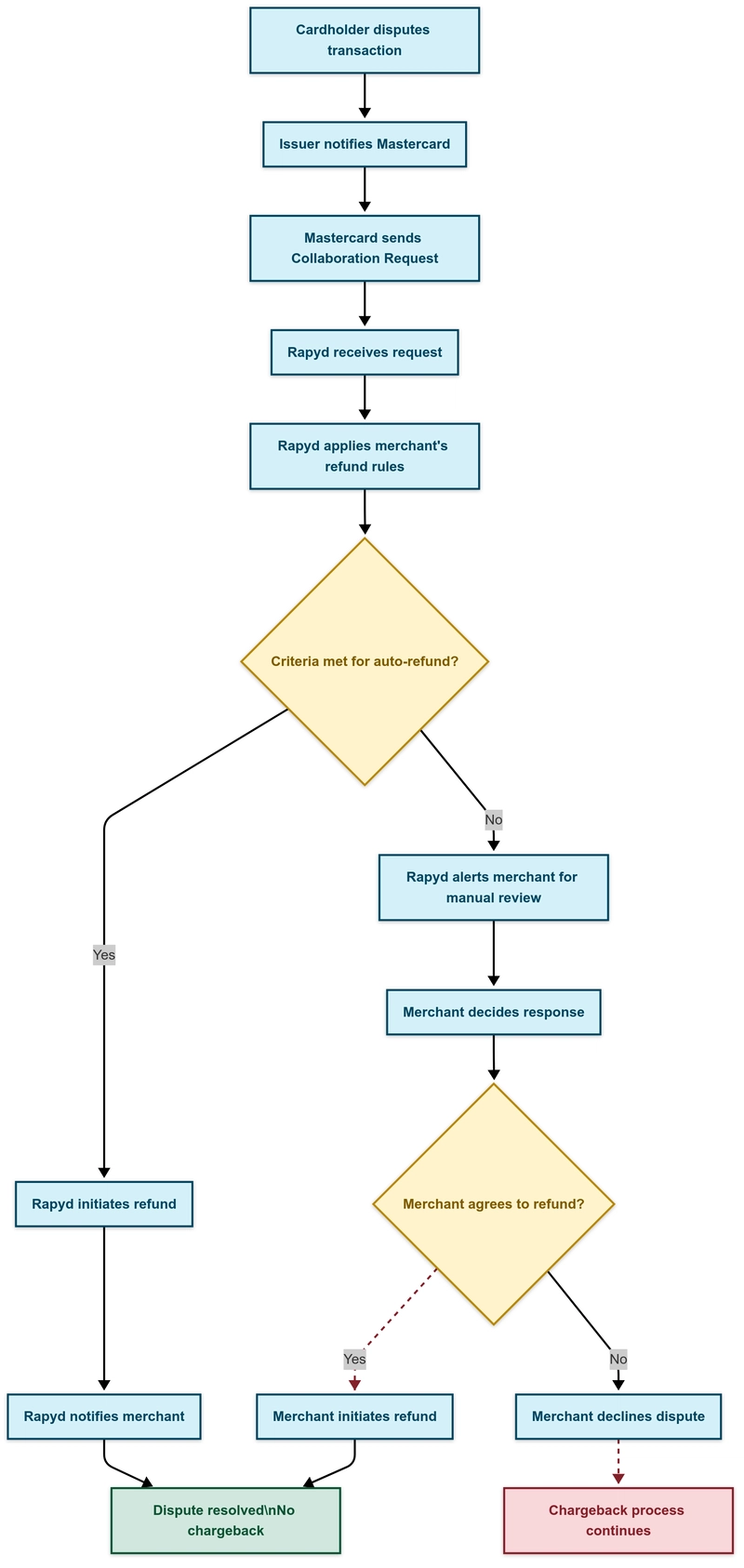 Rapyd lets merchants define automatic refund rules using the Client Portal to determine the conditions under which an automatic refund should be issued. When Rapyd receives a dispute notification from Mastercard Collaboration, it evaluates the merchant-defined rules, and if the criteria are met, it issues an automatic refund without merchant intervention. Otherwise, it notifies the merchant by sending a PAYMENT_DISPUTE_CREATED webhook event, and the merchant can perform additional checks before deciding the outcome.