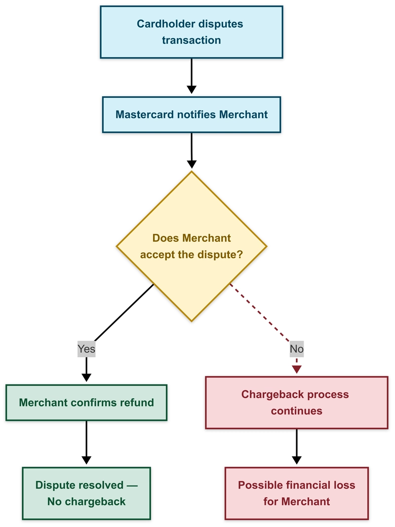 Collaboration alerts the merchant as soon as the transaction is disputed, allowing merchants to review the cardholder complaint and issue a refund if needed. If the merchant refunds the transaction, a chargeback is no longer needed, and Mastercard marks the dispute as resolved. If the refund is not processed, the dispute advances to the chargeback step, and the Collaboration process is completed.