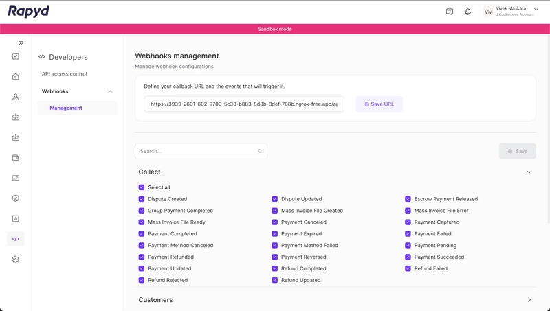 Note the forwarding URL and navigate to the Rapyd Client Portal to register it. Under Developers > Webhooks > Management, click Edit URL and update the endpoint to the following:
