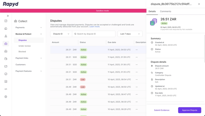You can also review the dispute details using the Collect > Review & Protect > Disputes tabs on the Rapyd Client Portal: