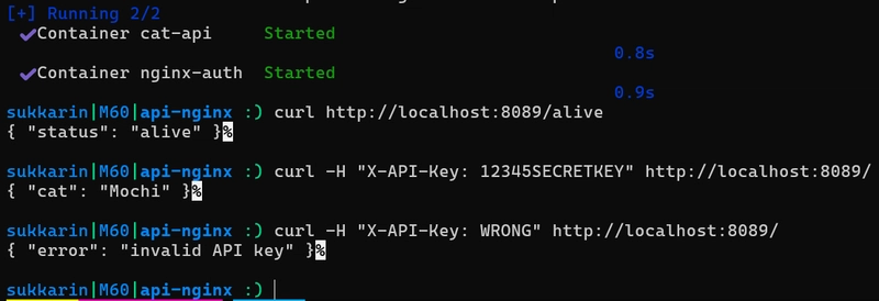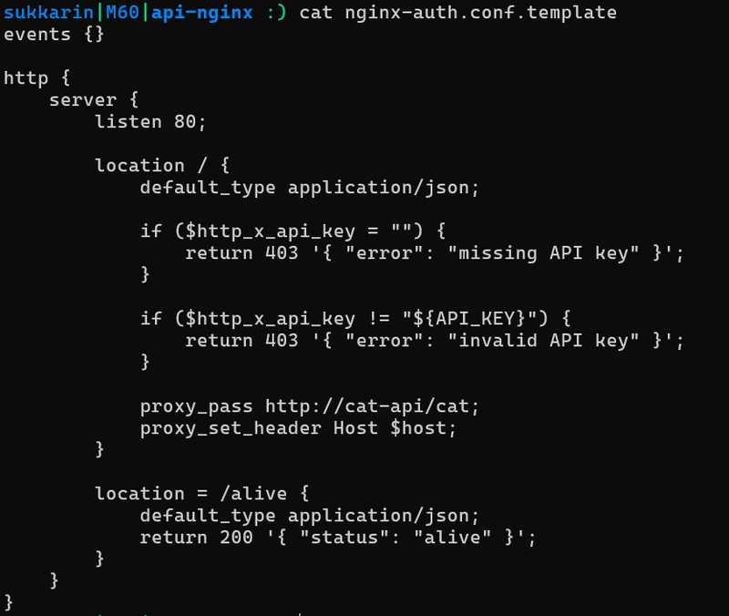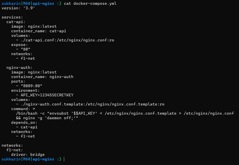 สิ่งที่ต้องทำต่อ ก็คือจำกัดการเข้าใช้บริการ cat-api โดยตรง โดยเราจะ bind port เฉพาะ NGINX ที่ทำหน้าที่ Authentication/Authorization เท่านั้น แล้วให้ NGINX เรียกผ่าน network: f1-net ไปยัง cat-api อีกต่อหนึ่ง