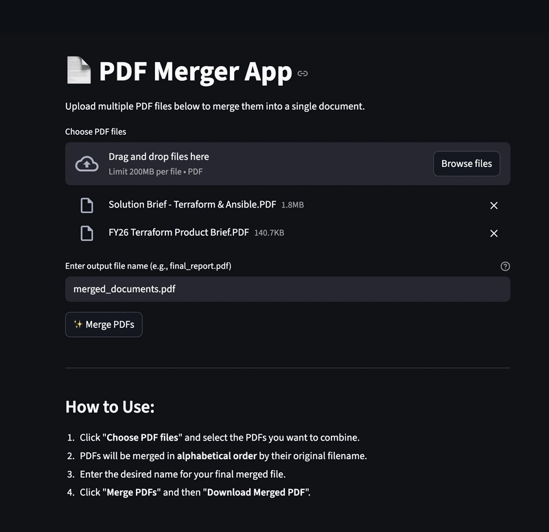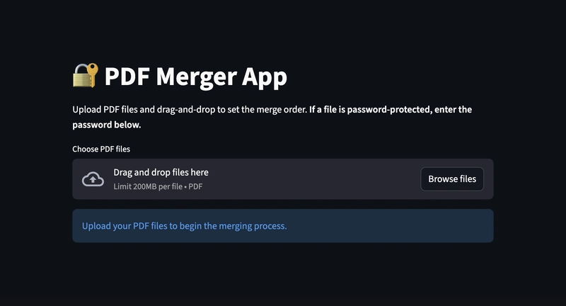 In conclusion, the Streamlit PDF Merger application is a local, and privacy-focused solution designed to address the genuine concerns of handling sensitive documents online. By offering drag-and-drop reordering, it guarantees that your final merged document follows your precise specifications. Crucially, its ability to decrypt and remove password protection from source files before merging eliminates the need to trust proprietary online services with your credentials. This application empowers you with a secure, customizable, and completely self-hosted tool, transforming a tedious and potentially risky task into a straightforward, efficient process right on your desktop.