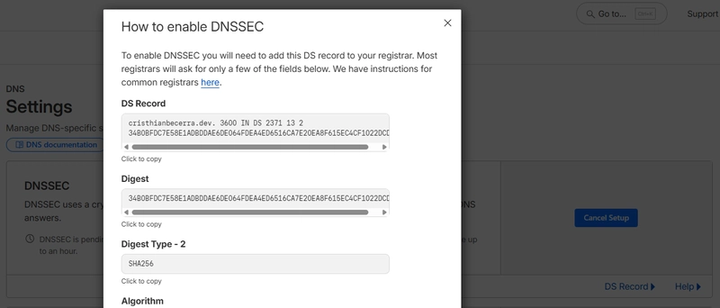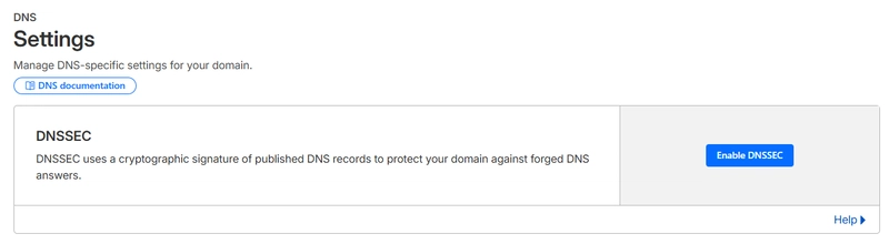 4. En Cloudflare, abre los DNS Settings del dominio correspondiente y selecciona Enable DNSSEC.